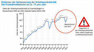 Die Arbeitsproduktivität als wichtiger Indikator der Leistung Deutschlands lag bis zum Jahr 2000 je Erwerbstätigen noch über 1 % pro Jahr, bis 2010 halbierte sie sich und nähert sich aktuell der Null-Prozent-Marke. Korrigiert man die Reduzierung der Arbeitsstunden pro Erwerbstätigen heraus, lag sie bis 2020 noch bei fast 1 %. Aktuell liegt sie bei 0 %.