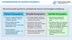 Neben den inhaltlichen Typen von Business Eco Systems wie Wissens, Innovations, Produktions oder Nachhaltigkeitsökosystemen spielt der Modus der Interaktion eine zentrale Rolle. Er bestimmt, wie Akteure zusammenkommen, wie Vertrauen entsteht und wie schnell Wissen und Innovation skaliert werden können. Grundsätzlich lassen sich drei Interaktionsmodi unterscheiden: Präsenz Ecosystems, virtuelle Ecosystems und hybride Ecosystems.