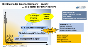 Die folgende Abbildung zeigt, wie Lean & Agile, Digitalisierung und KI in der Knowledge Creating Company zusammenwirken und als Lern- und Kompetenzbasis die Smart Factories der Typen I bis III erst ermöglichen.