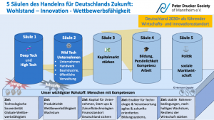 Die Gesamtlage und ihre Lösung lassen sich in die 5 Säulen des Handelns einordnen: Deep & High Tech schaffen die technologische Basis. Mid Tech und systemrelevante Bereiche sichern das industrielle Rückgrat. Ein leistungsfähiger Kapitalmarkt ermöglicht Investitionen. Bildung und Kompetenz bilden die Grundlage der Knowledge Creating Company. Politik und Ordnung setzen den wirksamen Rahmen für Energie, Rohstoffe, Handel, Regulierung und Geschwindigkeit.