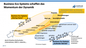 Die folgende Abbildung verdeutlicht, wie Business Ecosystems durch das Zusammenspiel von Start-ups, Unternehmen, Hochschulen und Initiativen das Momentum von Innovation, Gründung und Skalierung erzeugen – und damit erst echte Standortdynamik schaffen.