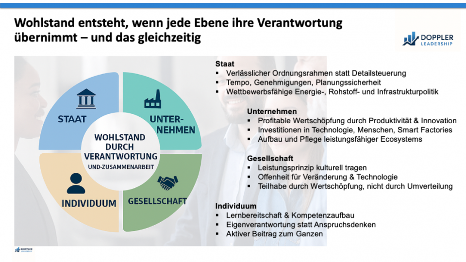 Die zentrale Aufgabe des Staates besteht darin, dauerhaft die besten Rahmenbedingungen zu gewährleisten – strategisch, vorausschauend und wirkungsorientiert. Als Ermöglicher von Wohlstand und Wertschöpfung trägt er Verantwortung für das funktionierende Zusammenspiel von Individuum, Gesellschaft, Unternehmen und öffentlicher Ordnung. Prinzipienorientierung statt Regelflut und Verantwortung beim Handelnden statt Verfahrensstau sind dabei entscheidend.