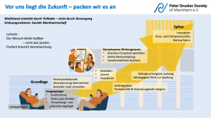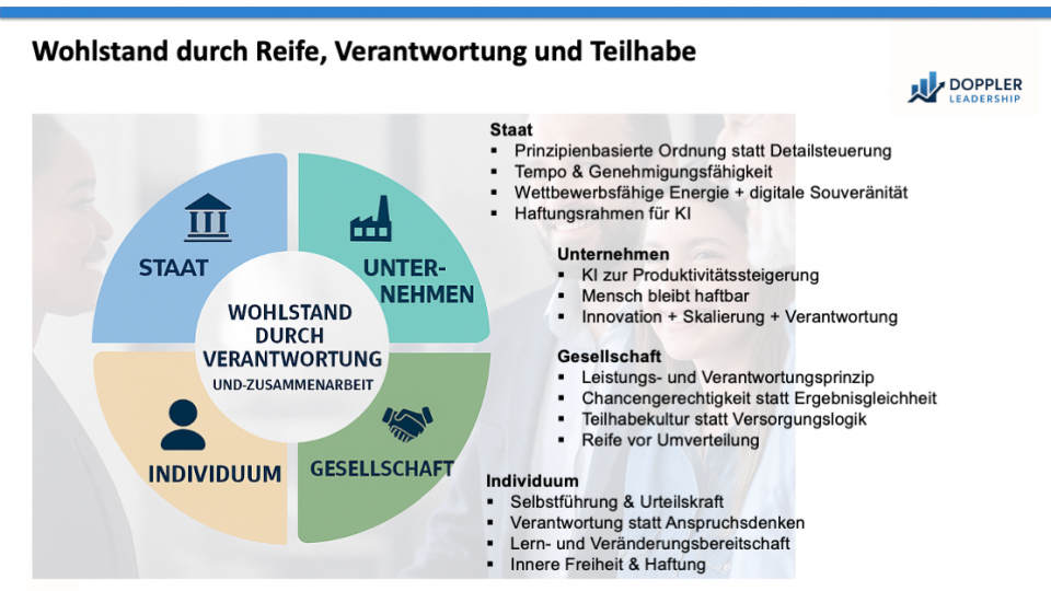 Haltung und Reife sind die innere Voraussetzung von Wohlstand – tragfähig werden sie aber erst durch wettbewerbsfähige ökonomische Rahmenbedingungen. Erst im gleichzeitigen Zusammenspiel von Individuum, Unternehmen, Gesellschaft und Staat entsteht nachhaltige Gestaltungskraft.