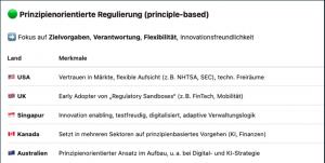 Prinzipienbasierte Regulierungsansätze sind international anschlussfähiger als detailverliebte nationale Vorschriften. Besonders in stark vernetzten und globalen Technologiefeldern – wie FinTech, Plattformökonomie oder industrieller KI – bietet ein gemeinsames Zielverständnis eine bessere Grundlage für regulatorische Kooperation und Investitionssicherheit.