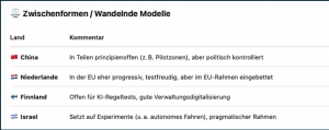 China geht zunehmend einen dritten Weg: „Move fast – but be careful“. Das bedeutet: hohe Geschwindigkeit, aber mit strategischer Steuerung. Regulatorische Freiräume werden bewusst gesetzt, jedoch eingebettet in langfristige Industriepolitik, Lernzyklen und Reallabore.