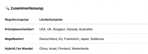 Viele Länder und Institutionen, darunter die OECD, empfehlen inzwischen hybride Ansätze: Hochrisikobereiche sollen regelbasiert reguliert bleiben, während innovationsfreundliche Zonen prinzipienbasiert organisiert werden.