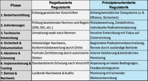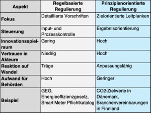 Die folgende Tabelle zeigt exemplarisch, wie sich regel- und prinzipienbasierte Regulierungsansätze in Logik, Wirkung und Umsetzung unterscheiden: