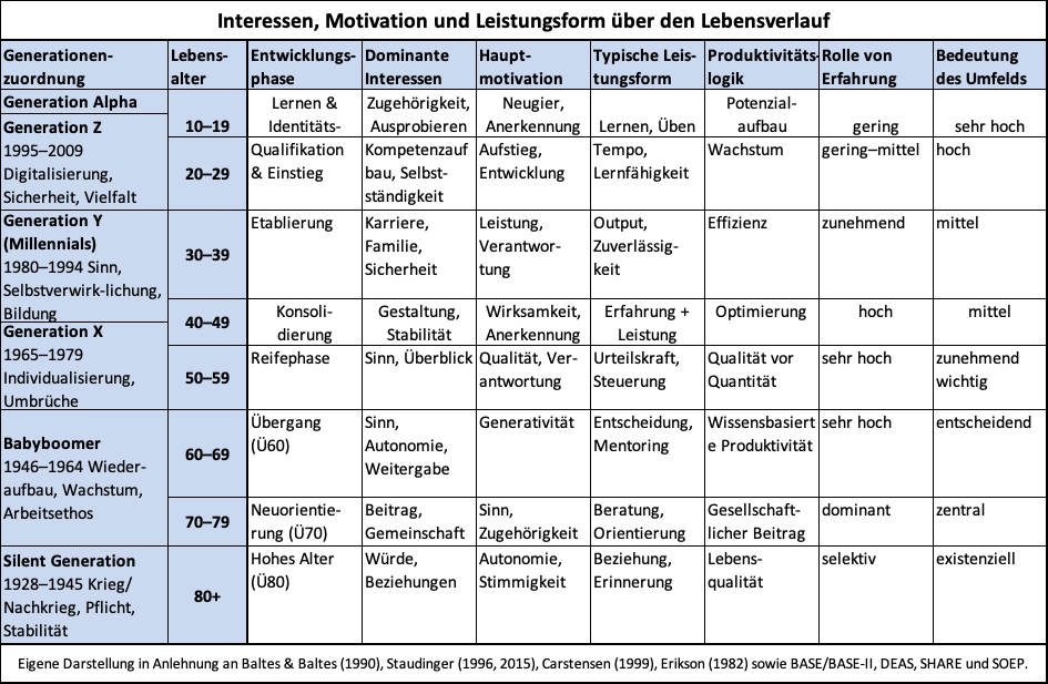 Zusammenfassend zeigen die Befunde, dass Interessen, Motivation und Leistungsfähigkeit sich im Laufe des höheren Erwachsenenalters dynamisch verschieben, jedoch kein einheitliches Nachlassen auf allen Ebenen erfolgt. Ältere Menschen ab 60 orientieren sich weniger an extrinsischen Aufstiegszielen und stärker an intrinsischen Werten wie Sinn, Weitergabe von Erfahrung, Autonomie und emotionalem Wohlbefinden. Diese motivationalen Änderungen gehen einher mit Anpassungsstrategien, die erfolgreiche Entwicklungsverläufe ermöglichen. Leistung und Produktivität bleiben in vielen Bereichen bis ins hohe Alter erhalten oder können durch Erfahrung sogar gesteigert werden. Besonders in wissensintensiven, planenden oder beratenden Aufgabenfeldern können Ältere ihre Stärken – reichhaltiges Erfahrungswissen, ganzheitliches Denken, soziale Kompetenz – ausspielen. Dagegen treten in rein ausführenden, körperlich belastenden Tätigkeiten ab einem gewissen Alter Einschränkungen auf, wobei hier technologische und organisatorische Anpassungen (z. B. ergonomische Hilfen, flexible Arbeitszeiten) viel bewirken können. Entscheidend ist, die heterogene Leistungsbandbreite im Alter anzuerkennen: Die entscheidende Trennlinie verläuft nicht zwischen Altersgruppen, sondern zwischen Umfeldern, die Erfahrung produktiv machen, und solchen, die sie neutralisieren. Statt Altersstereotypen braucht es differenzierte Betrachtungen und Maßnahmen, die Kontext und Plastizität berücksichtigen.