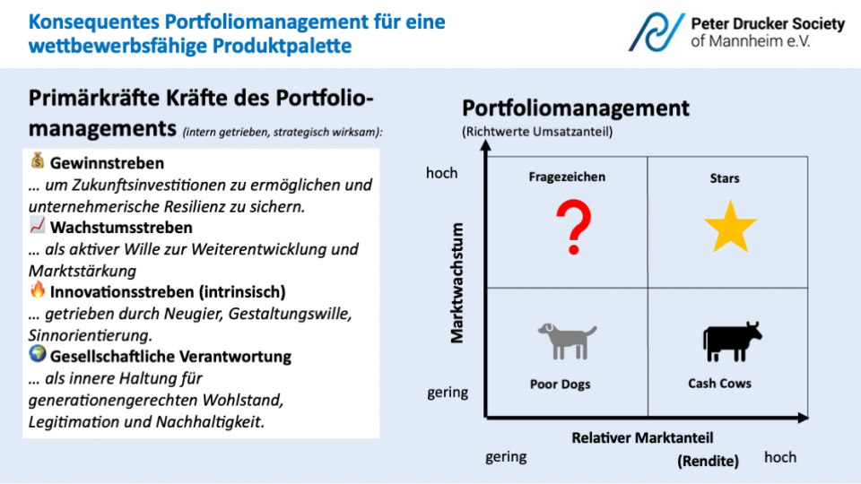 Unternehmen stehen in einem ständigen Spannungsfeld zwischen Effizienzsteigerung und Innovation. Gewinne sind die Kosten für das Überleben, wie Peter Drucker es treffend formulierte. Doch Gewinn allein reicht nicht – nur mit klarem Wachstumsstreben und strategischer Steuerung des Produktportfolios lassen sich langfristig Marktführerschaft und Arbeitsplatzsicherheit gewährleisten.