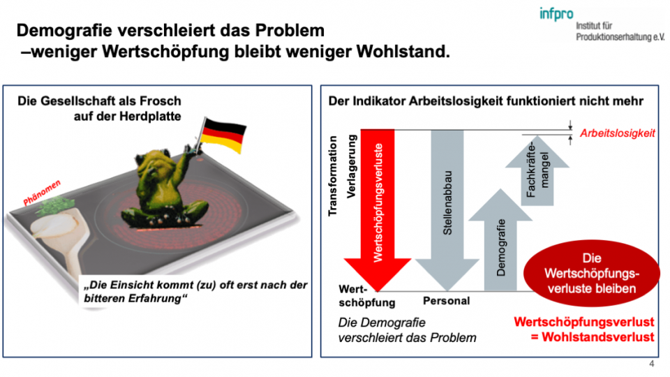 Mit jeder Produktions-verlagerung schwindet die Basis für unseren Wohlstand. Während früher Stellenabbau unmittelbar zu steigender Arbeitslosigkeit führte, bleibt dieser Effekt heute aus, weil ältere Arbeitnehmer in den Ruhestand gehen und sich die Fachkräftesituation verschiebt. Doch der Verlust von Wertschöpfung bedeutet weniger Wohlstand für alle.